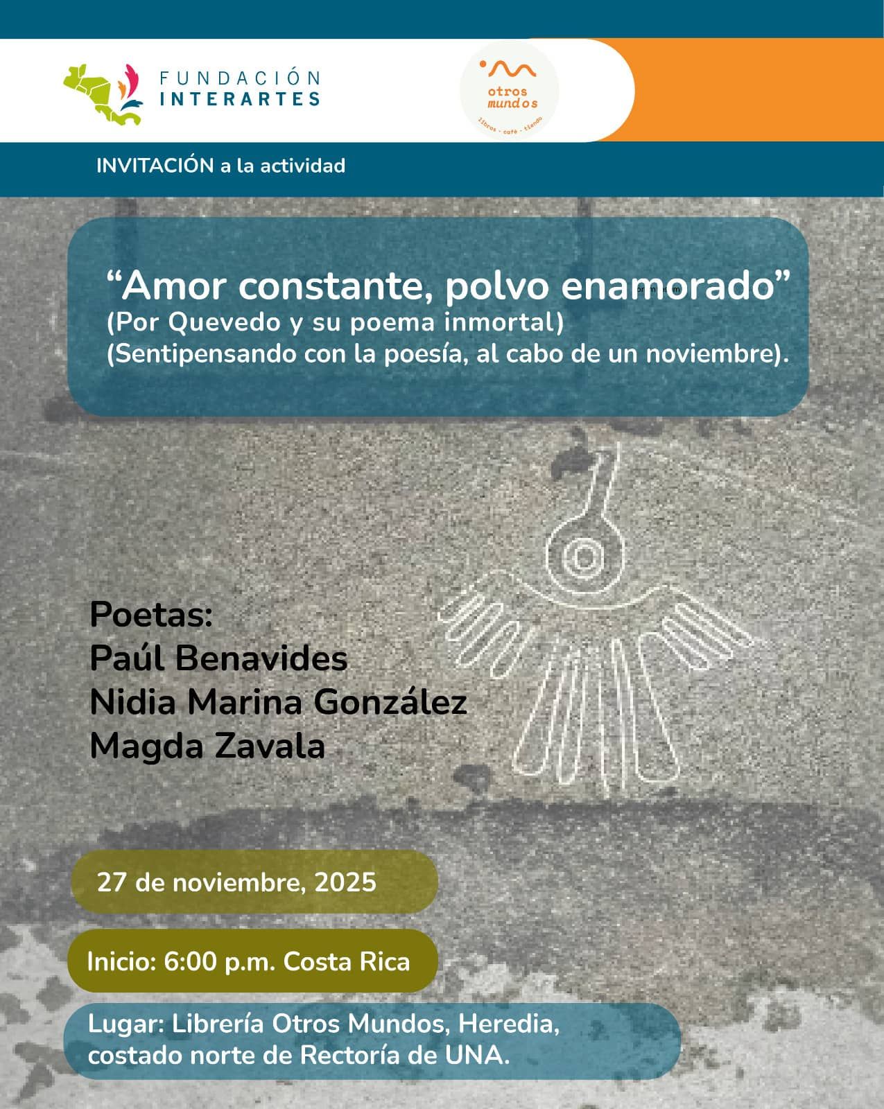 La Fundación Interartes y la Librería Otros Mundos invitan a una actividad literaria que propone un encuentro distinto a las lecturas poéticas tradicionales. No es una vitrina de autoras y autores, sino un espacio de conversación colectiva entre personas lectoras, degustadoras de poesía y sujetos reflexivos convocados a pensar con sensibilidad y profundidad.