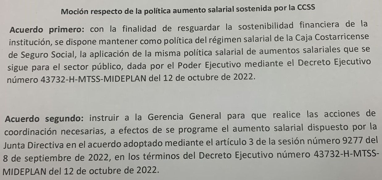 “Por ende, agrega el dirigente, desde el Sindicato de Funcionarios Públicos de Costa Rica se rechaza la moción, declarando a Juan Ignacio non grato, además, se le pide a la junta directiva que ordene, -con base en el acuerdo del 08 de setiembre del 2022, ratificado el 15 de setiembre del mismo año-, al gerente general de la CCSS que proceda a pagar y fijar una fecha de pago retroactivo de los salarios pendientes. Esto tiene respaldo además en la resolución de la Contraloría General de la República, según la cual, debe prevalecer la autonomía institucional”.