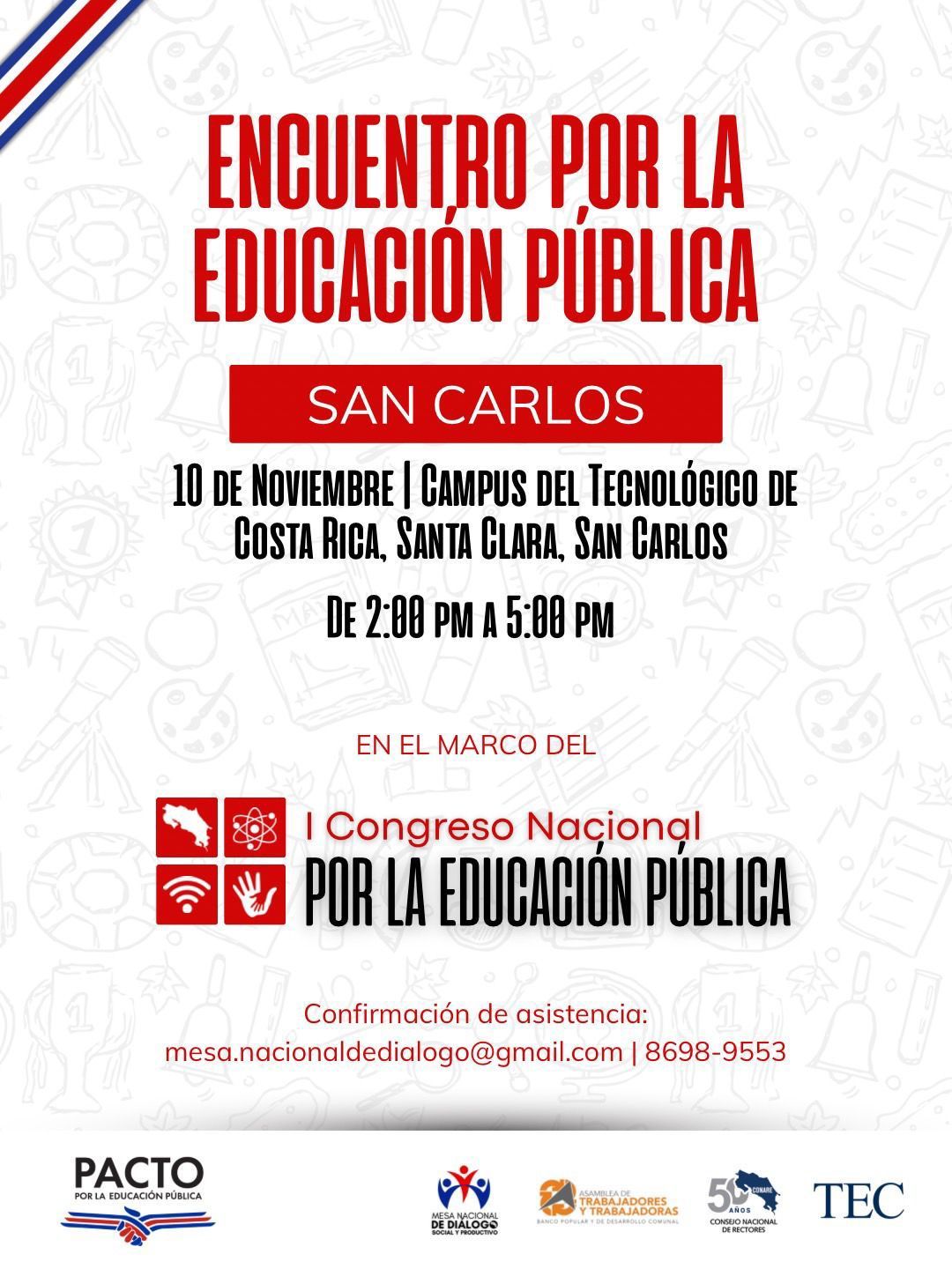 - San Carlos: 10 de noviembre, 2:00 p.m., TEC de San Carlos.