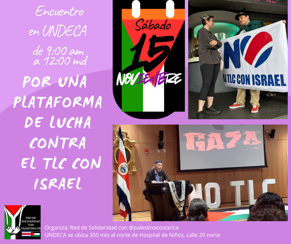 La Red de Solidaridad con Palestina Costa Rica anunció la conformación de la Plataforma de Lucha contra el TLC con Israel, un espacio amplio de articulación social que busca frenar la posible aprobación del Tratado de Libre Comercio entre Costa Rica e Israel, negociado y presentado por el Poder Ejecutivo sin transparencia hacia la sociedad civil.
