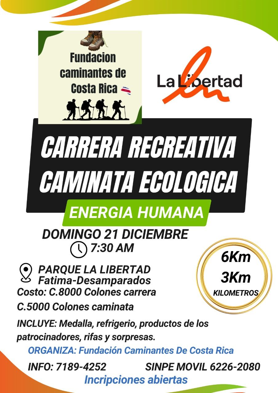 La Fundación Caminantes de Costa Rica invita a participar en la Carrera Recreativa – Caminata Ecológica “Energía Humana”, una actividad deportiva y familiar que se realizará el domingo 21 de diciembre, a partir de las 7:30 a.m., en el Parque La Libertad, ubicado en Fátima de Desamparados.