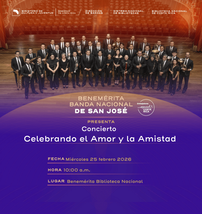 El Ministerio de Cultura y Juventud, por medio de la Banda Nacional de San José y la Benemérita Biblioteca Nacional de Sinabi, se complacen en invitarle al concierto Celebrando el Amor y la Amistad con la Benemérita Banda Nacional de San José.