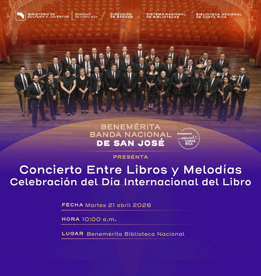 El Ministerio de Cultura y Juventud, por medio de la Banda Nacional de San José y la Benemérita Biblioteca Nacional de Sinabi, se complacen en invitarle al Concierto Entre libros y melodías con la Benemérita Banda Nacional de San José.