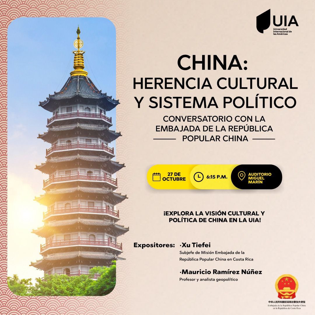 La Universidad Internacional de las Américas (UIA) realizará el conversatorio “China: herencia cultural y sistema político”, con la participación de la Embajada de la República Popular China en Costa Rica, el lunes 27 de octubre de 2025, a las 6:15 p. m., en el Auditorio Miguel Marín.