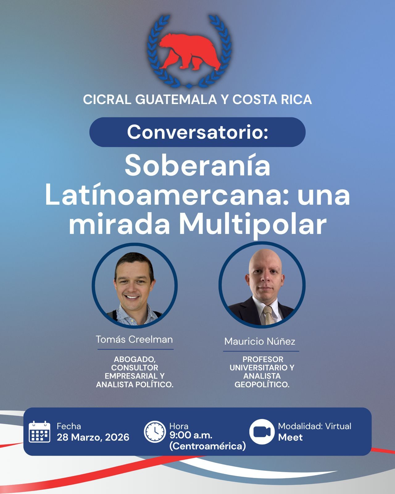 Organizaciones vinculadas al Centro de Integración y Cooperación de Rusia y América Latina (CICRAL) en Guatemala y Costa Rica invitan al conversatorio “Soberanía Latinoamericana: una mirada multipolar”, un espacio orientado a fortalecer el debate regional sobre el papel de América Latina en el actual escenario internacional.