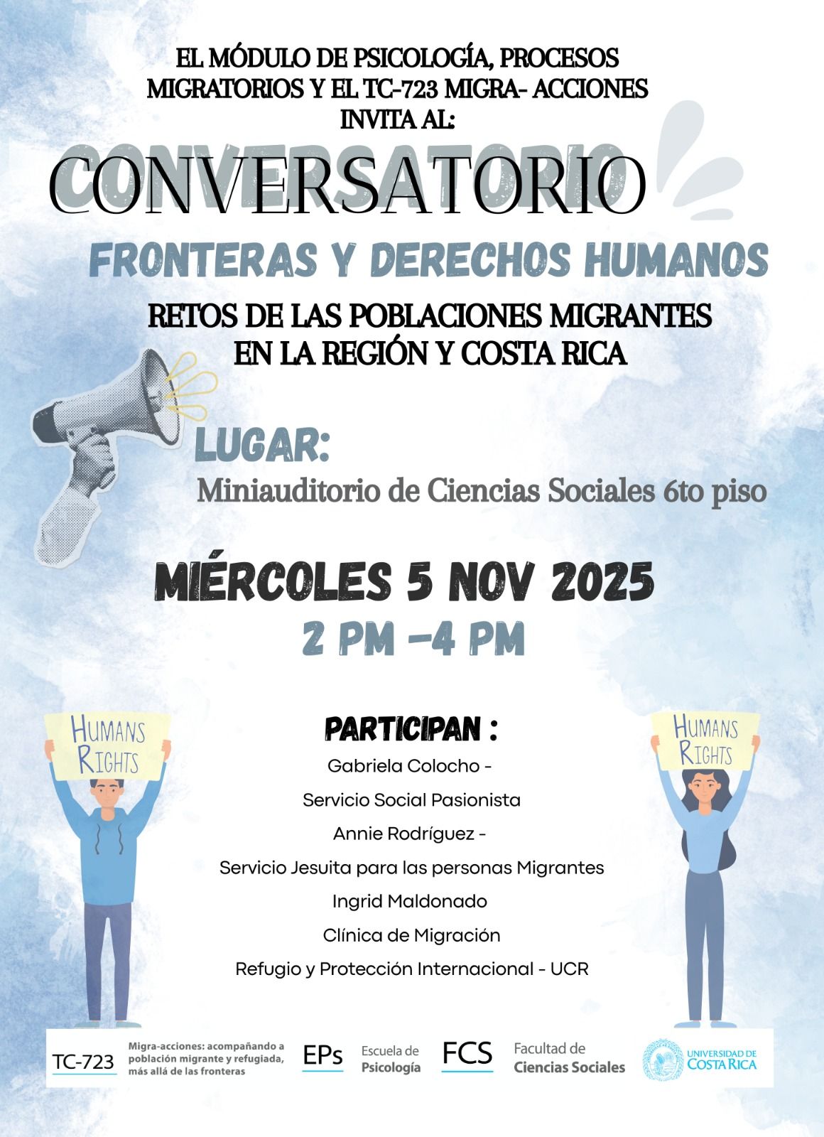 El Módulo de Psicología, Procesos Migratorios y el TCU-723 “Migra-Acciones” de la Universidad de Costa Rica (UCR) invitan al conversatorio “Fronteras y derechos humanos: retos de las poblaciones migrantes en la región y Costa Rica”, que se realizará el miércoles 5 de noviembre de 2025, de 2:00 pm a 4:00 pm, en el mini auditorio de la Facultad de Ciencias Sociales, sexto piso.