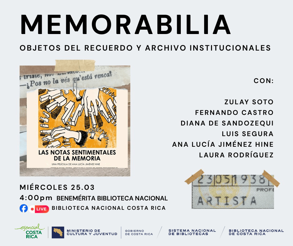 El Ministerio de Cultura y Juventud, mediante la Benemérita Biblioteca Nacional del Sinabi se complace en invitarle al conversatorio Memorabilia: objetos del recuerdo y archivo institucionales, con la participación de Zulay Soto, Fernando Castro, Diana de Sandozequi, Luis Segura, Ana Lucía Jiménez Hine y Laura Rodríguez.