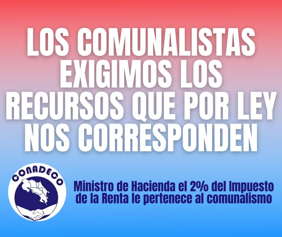 Desde la Confederación Nacional de Asociaciones de Desarrollo Comunal se exigen los recursos que por ley les corresponde, pues según la legislación el 2% del Impuesto de la Renta le pertenece al comunalismo. El Ministerio de Hacienda debe entregarlo.