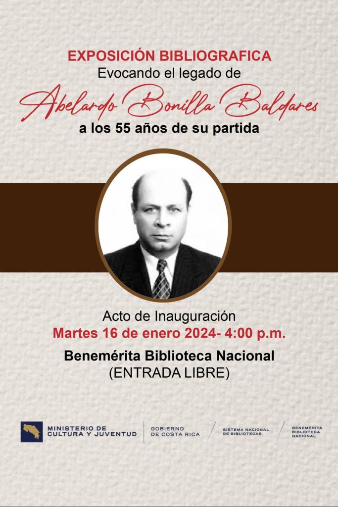 La Benemérita Biblioteca Nacional se complace en invitarle a la inauguración de la exposición bibliográfica Evocando el legado de Abelardo Bonilla Baldares, a los 55 años de su fallecimiento.