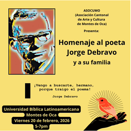 La Asociación Cantonal de Arte y Cultura de Montes de Oca (ASOCUMO) realizará un homenaje al poeta costarricense Jorge Debravo y a su familia, como un acto de reconocimiento a su legado literario y humano, profundamente ligado a las luchas sociales, la sensibilidad popular y la palabra comprometida.