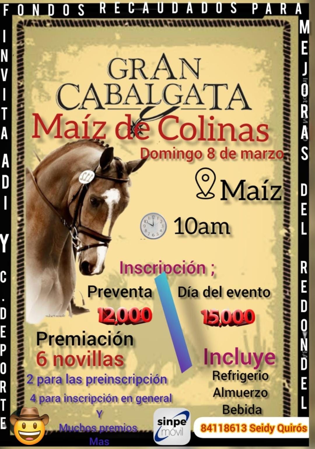 Para el domingo 08 de marzo, la fiesta continúa con actividades deportivas y a partir de las 10am, la Gran Cabalgata Maíz de Colinas 2026, donde habrá valiosos premios entre los que se destacan la rifa de 6 novillas.