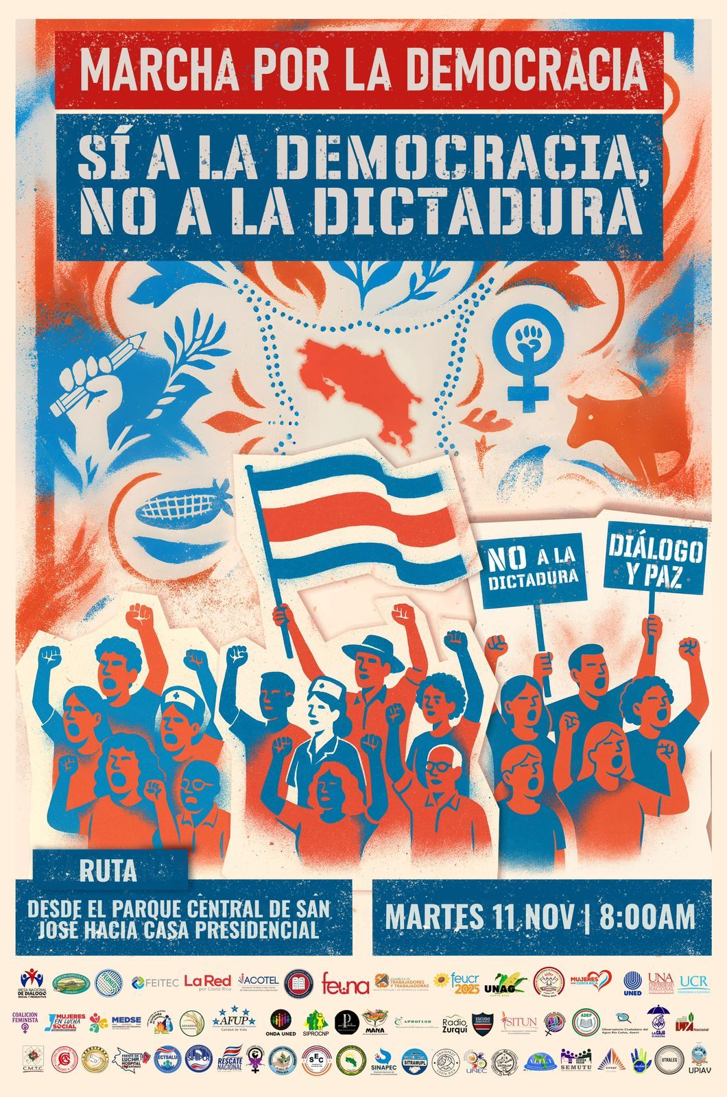 Las universidades públicas, organizaciones sociales, sindicales, agropecuarias, comunales, ambientales, estudiantiles, laborales, de mujeres y de la sociedad civil de todo el país convocan al pueblo de Costa Rica a participar masivamente en la Gran Marcha Nacional por la Democracia Costarricense, este martes 11 de noviembre de 2025, bajo el lema: “Sí a la democracia, no a la dictadura.”