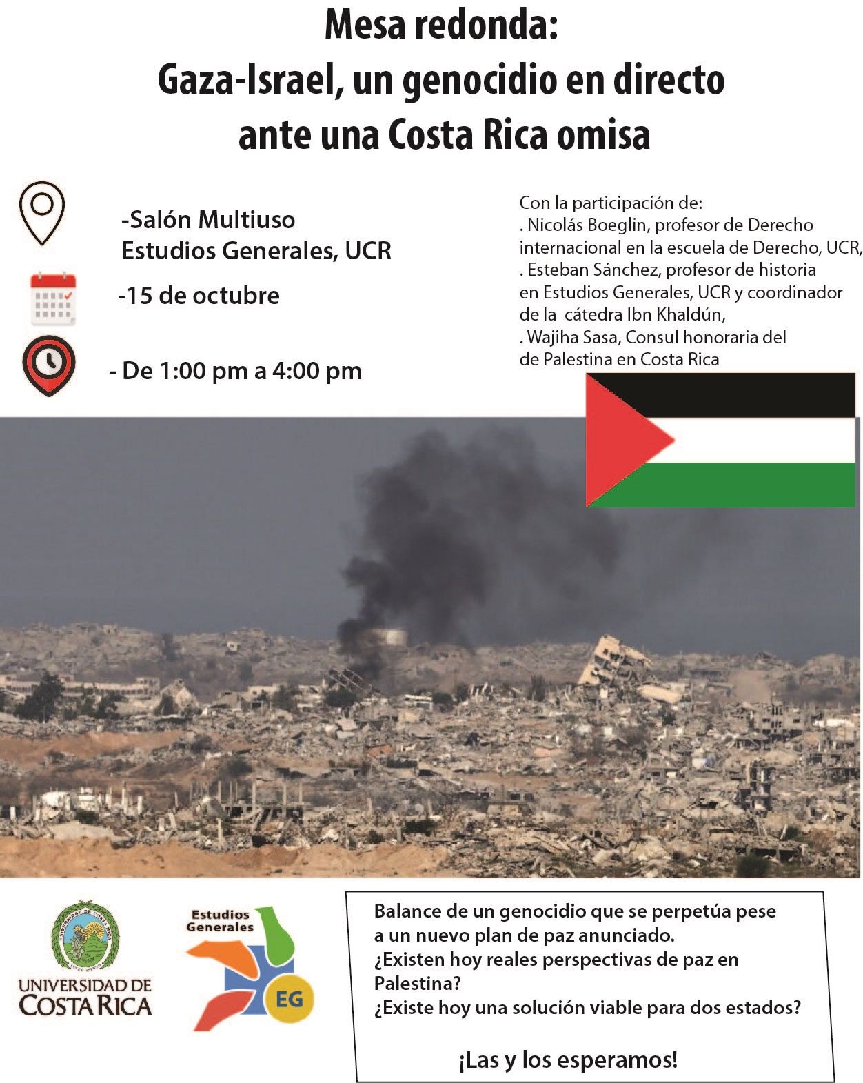 Este 15 de octubre, la Universidad de Costa Rica (UCR) realizará la mesa redonda titulada “Gaza-Israel, un genocidio en directo ante una Costa Rica omisa”, actividad que se llevará a cabo en el Salón Multiuso de la Escuela de Estudios Generales, de 1:00 p. m. a 4:00 p. m.