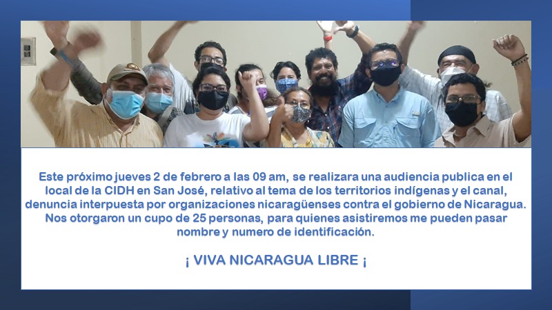 El próximo jueves 02 de febrero a las 9:00 a.m. se realizará una audiencia en el local de la Corte Interamericana de Derechos Humanos (CIDH) en San José, relativo al tema de los territorios indígenas y el canal interoceánico, esto por una denuncia interpuesta por organizaciones nicaragüenses contra el gobierno de Nicaragua.