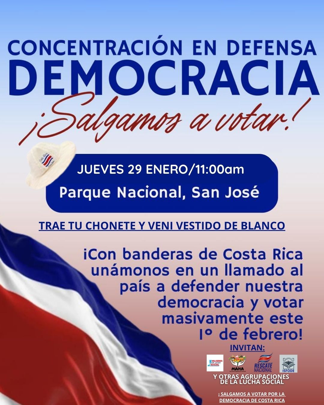 La actividad se realizará el jueves 29 de enero, a las 11:00 a.m., en el Parque Nacional, en San José, bajo la consigna “¡Salgamos a votar!”. La convocatoria invita a las personas asistentes a llevar chonete, vestirse de blanco y portar banderas de Costa Rica, como símbolo de unidad y defensa del sistema democrático.