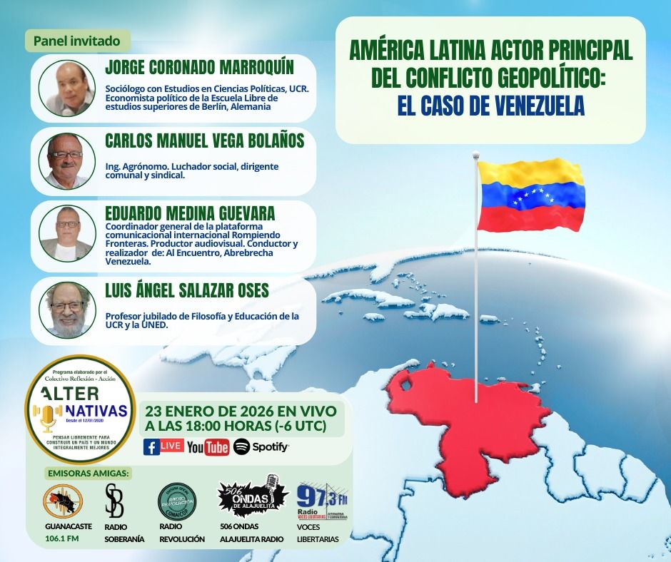 El panel estará integrado por Jorge Coronado Marroquín, sociólogo con estudios en Ciencias Políticas y economista político, egresado de la Escuela Libre de Estudios Superiores de Berlín, Alemania; Carlos Manuel Vega Bolaños, ingeniero agrónomo, luchador social y dirigente comunal y sindical; Eduardo Medina Guevara, coordinador general de la plataforma comunicacional internacional Rompiendo Fronteras, productor audiovisual y conductor del programa Al Encuentro, Abrebrecha Venezuela; y Luis Ángel Salazar Oses, profesor jubilado de Filosofía y Educación de la Universidad de Costa Rica y la Universidad Estatal a Distancia.