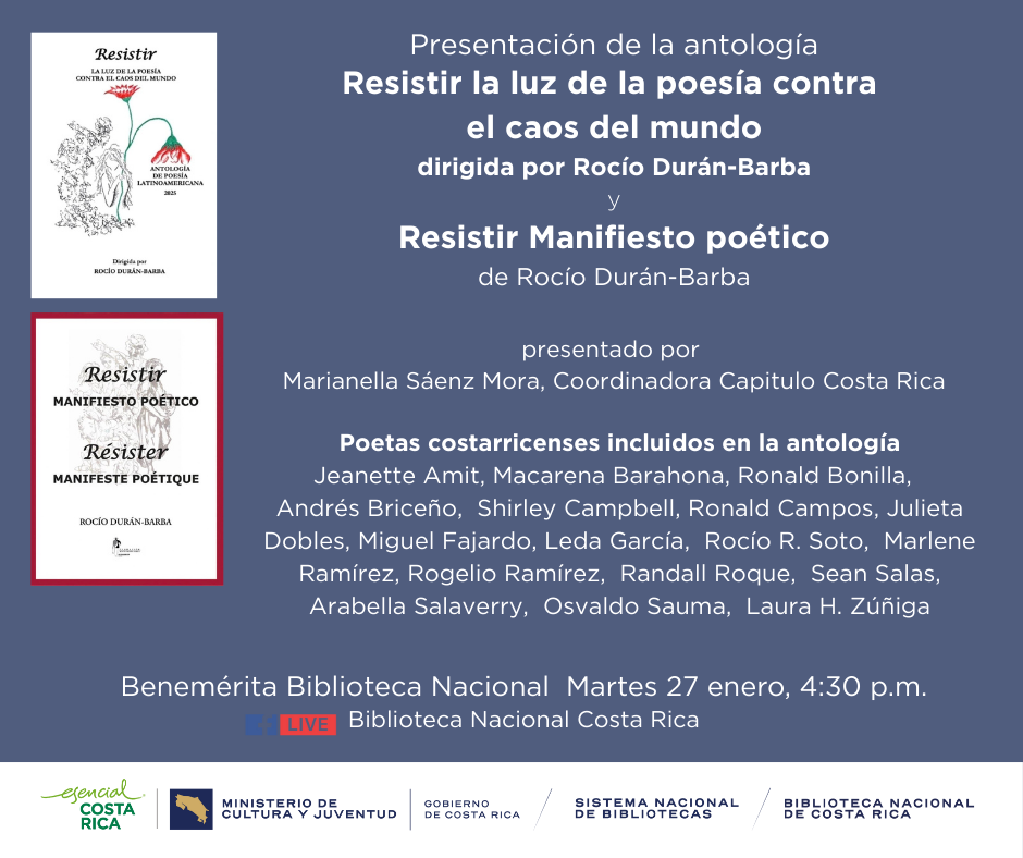 El Ministerio de Cultura y Juventud, por medio de la Benemérita Biblioteca Nacional del Sinabi, se complace en invitarle a la presentación de la antología Resistir: la luz de la poesía contra el caos del mundo dirigida por Rocío Durán Barba y de Resistir : manifiesto poético de Rocío Durán Barba, presentado por Marianella Sáenz, Coordinadora Capítulo Costa Rica.