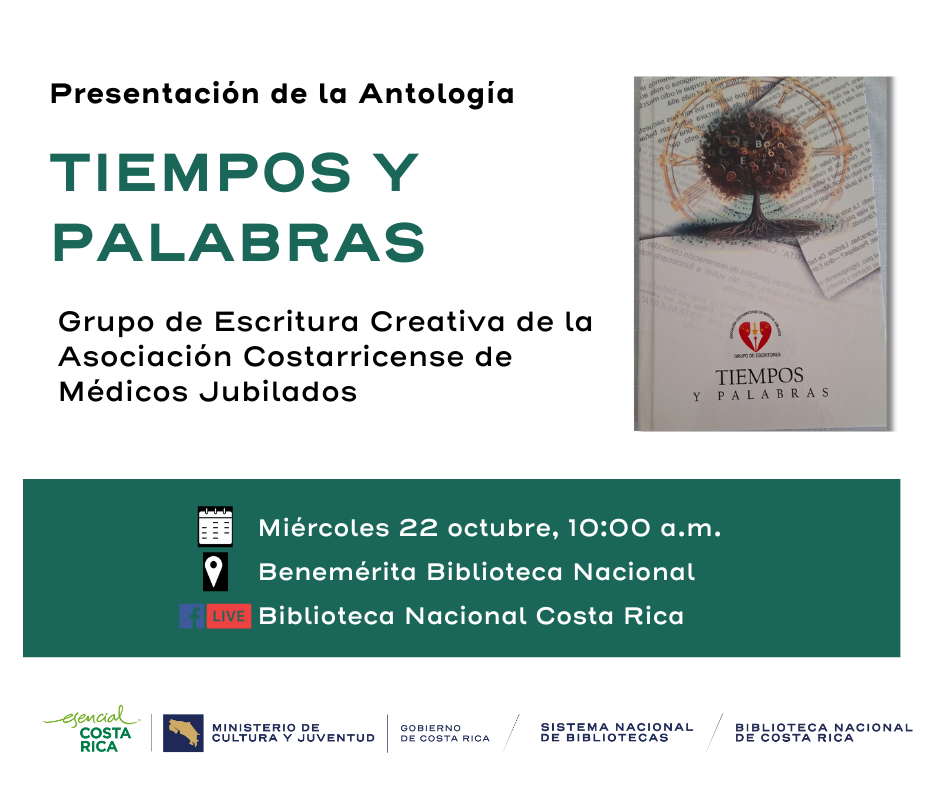 El Grupo de Escritura Creativa de la Asociación Costarricense de Médicos Jubilados y el Ministerio de Cultura y Juventud, por medio de la Benemérita Biblioteca Nacional de SINABI, se complacen en invitarle a la presentación de la Antología Tiempos y Palabras del Grupo de Escritura Creativa de la Asociación Costarricense de Médicos Jubilados.