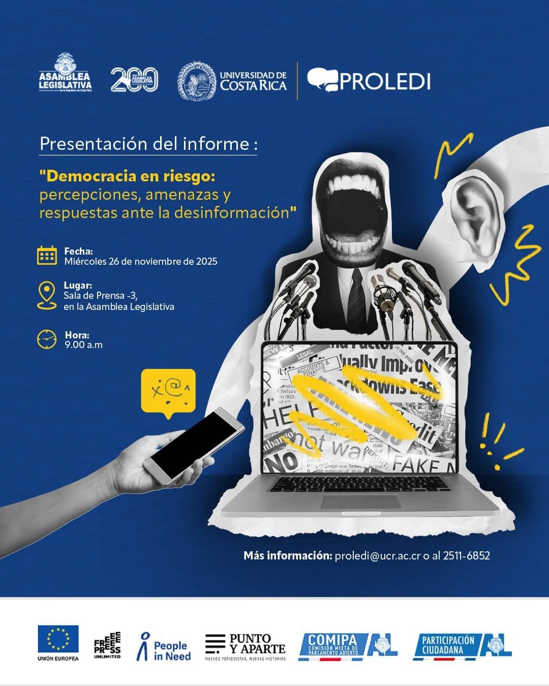 El próximo miércoles 26 de noviembre, a las 9:00 a.m., se presentará el informe “Democracia en riesgo: percepciones, amenazas y respuestas ante la desinformación” en la Sala de Prensa -3 de la Asamblea Legislativa. La actividad es organizada por el Programa de Libertad de Expresión y Derecho a la Información (PROLEDI-UCR), con el respaldo institucional de la Universidad de Costa Rica, la Asamblea Legislativa, y diversas organizaciones aliadas nacionales e internacionales.