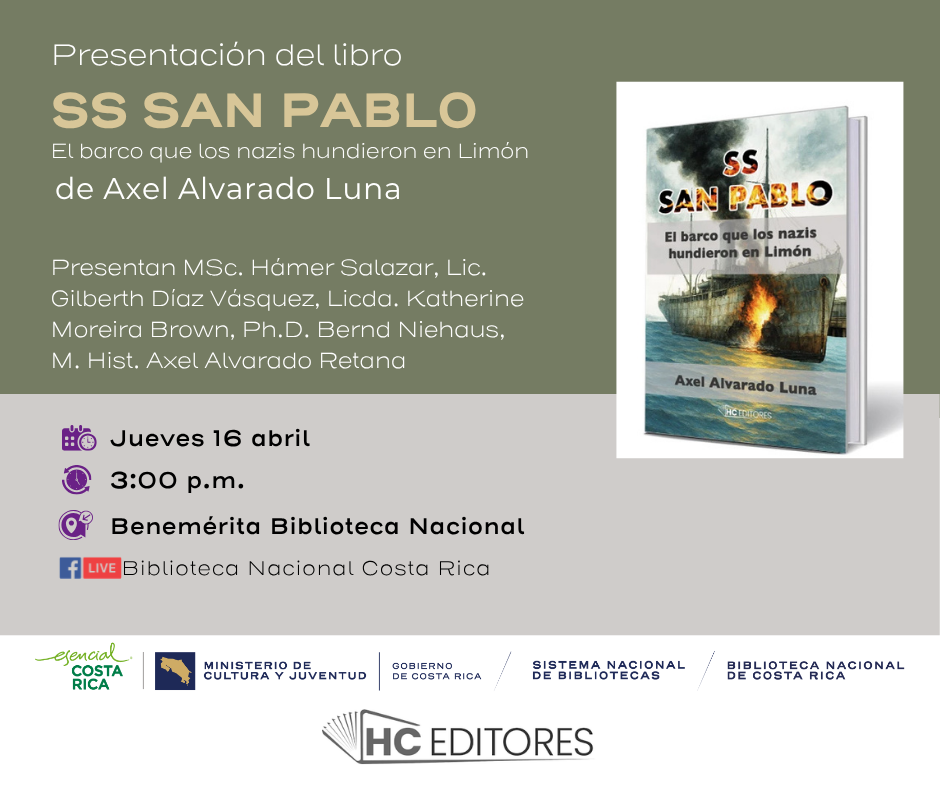 HC Editores y el Ministerio de Cultura y Juventud, por medio de la Benemérita Biblioteca Nacional del Sinabi se complace en invitarle a la presentación del libro SS San Pablo: el barco que los nazis hundieron en Limón de Axel Alvarado Luna. Participan Lic. Hámer Salazar, Lic. Gilberth Díaz Vásquez, Licda Katherine Moreira Brown, PhD. Bernd Niehaus, M. Hist Axel Alvarado Luna.