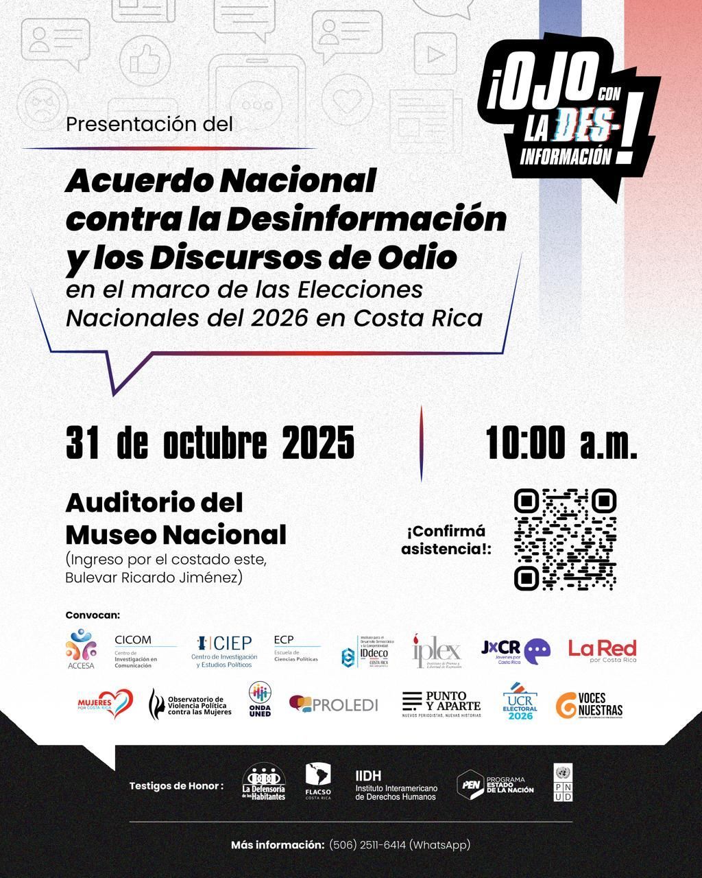 “Construyamos una democracia libre de desinformación y odio”, es el llamado con el que diversas organizaciones y colectivos convocan a la presentación del Acuerdo Nacional contra la Desinformación y los Discursos de Odio, en el marco de las Elecciones Nacionales del 2026 en Costa Rica.