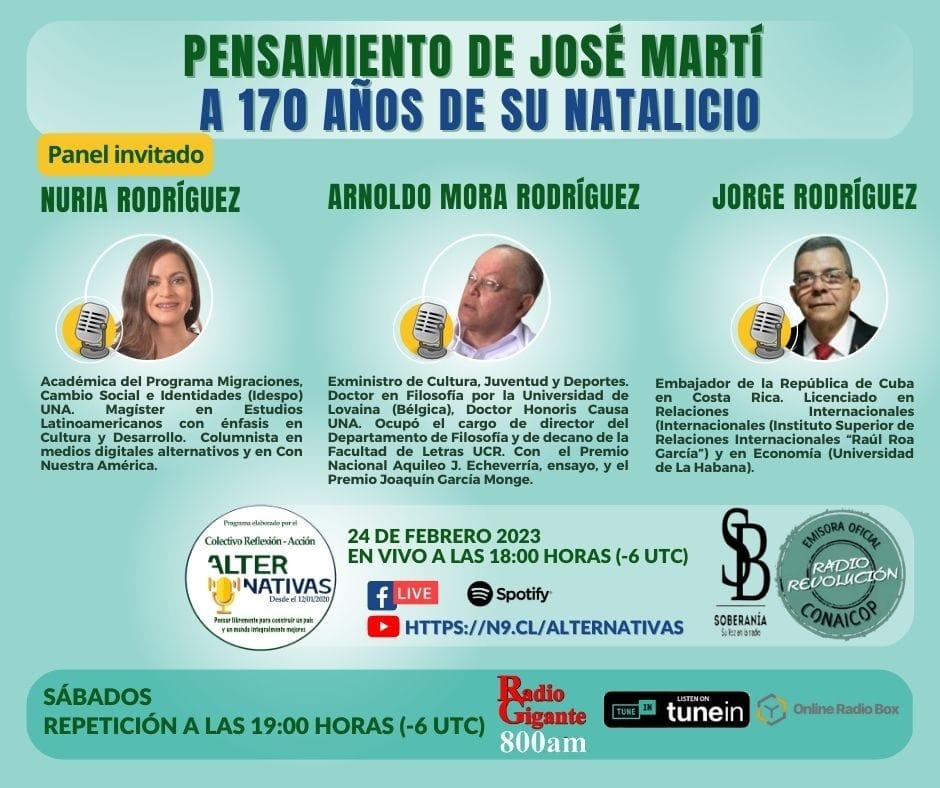 Este próximo viernes 24 de febrero de 2023 a las 18:00 horas (-6 UTC) se dará un programa sobre el “Pensamiento de José Martí: a 170 años de su natalicio” por ALTERNATIVAS. Contará con la participación de Nuria Rodríguez, una académica del Programa Migraciones, Cambio Social e Identidades (Idespo), Magíster en Estudios Latinoamericanos con énfasis en Cultura y Desarrollo, y columnista en medios digitales alternativos y en Con Nuestra América, Arnoldo Mora Rodríguez, exministro de Cultura, Juventud y Deportes, Doctor en Filosofía por la Universidad de Lovaina, Bélgica, Doctor Honoris Causa UNA, fue director del Departamento de Filosofía y de Decano de la Facultad de Letras de la UCR, y posee el Premio Nacional Aquileo J. Echeverría, ensayo y el Premio Joaquín García Monge. Contará también con la participación de Jorge Rodríguez, Embajador de la República de Cuba en Costa Rica, es Licenciado en Relaciones Internacionales (Instituto Superior de Relaciones Internacionales “Raúl Roa García” y en Economía (Universidad de La Habana).