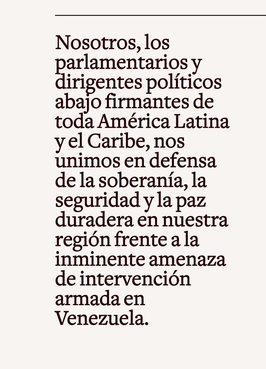 Nosotros, los parlamentarios y dirigentes políticos abajo firmantes de toda América Latina y el Caribe, nos unimos en defensa de la soberanía, la seguridad y la paz duradera en nuestra región frente a la inminente amenaza de intervención armada en Venezuela.