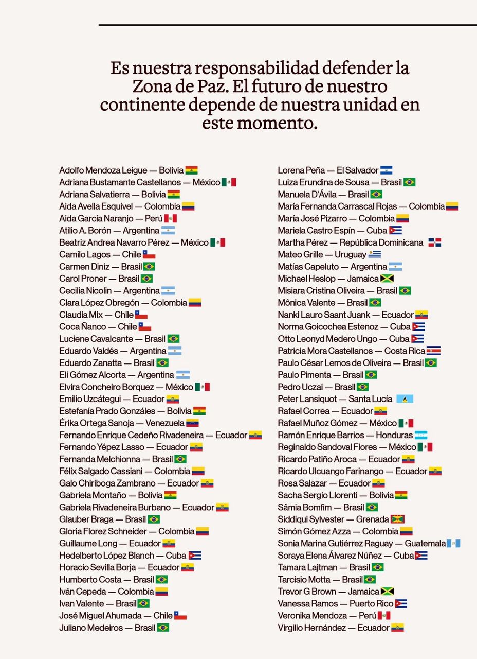 Larga lista de firmantes de toda América Latina y el Caribe, entre ellos representantes de Bolivia, México, Colombia, Brasil, Argentina, Perú, Cuba, Ecuador, Costa Rica y otros países.