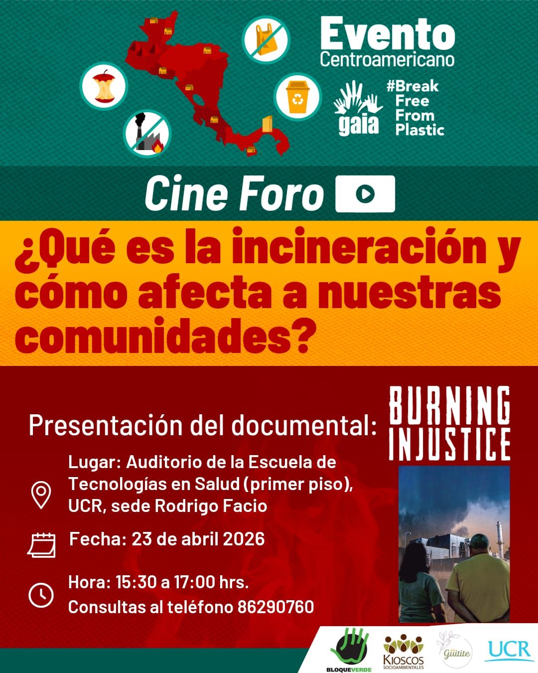 Como parte de esta iniciativa, el próximo jueves 23 de abril se realizará el cineforo “¿Qué es la incineración y cómo afecta a nuestras comunidades?”, en el auditorio de la Escuela de Tecnologías en Salud (primer piso), en la sede Rodrigo Facio de la Universidad de Costa Rica, de 3:30 p. m. a 5:00 p. m.