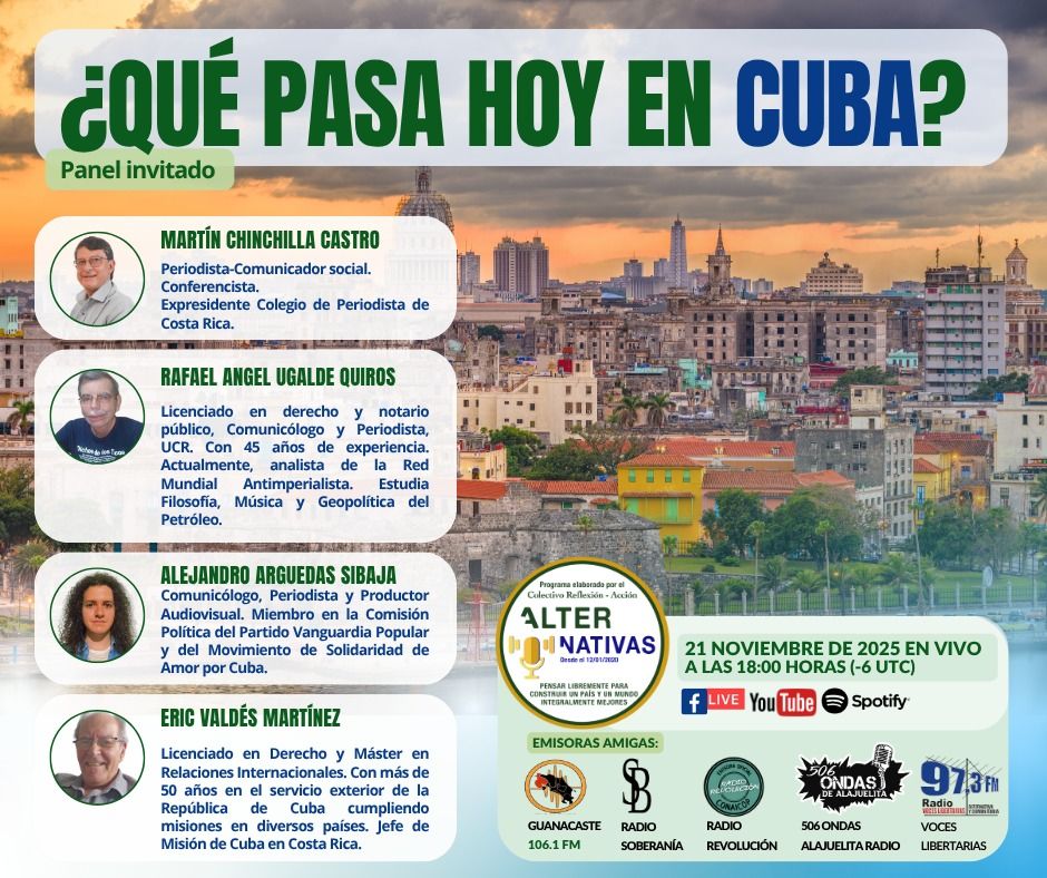 El programa Alternativas dedicará su transmisión del 21 de noviembre de 2025, a partir de las 6:00 p.m. (hora de Costa Rica, -6 UTC), a un tema de relevancia regional: la situación actual de Cuba, desde perspectivas políticas, geopolíticas, comunicacionales y diplomáticas.