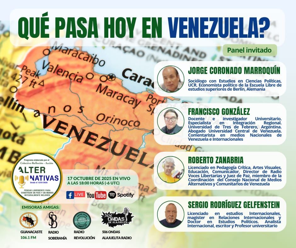 El programa Alternativas, producido por el Colectivo Reflexión-Acción, dedicará su próxima emisión al análisis de la situación actual en Venezuela. El espacio se transmitirá este viernes 17 de octubre de 2025, a las 6:00 pm (hora de Costa Rica), por Facebook Live, YouTube y Spotify.