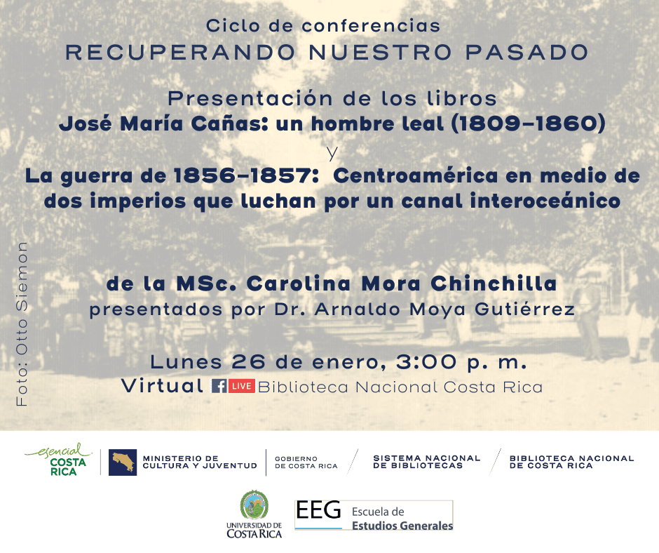 El Ministerio de Cultura y Juventud, por medio de la Benemérita Biblioteca Nacional del Sinabi y la Escuela de Estudios Generales de la Universidad de Costa Rica, se complacen en invitarle a la presentación de los libros José María Cañas: un hombre leal (1809-1860) y La guerra de 1856-1857: Centroamérica en medio de dos imperios que luchan por un canal interoceánico de la M.Sc. Carolina Mora y presentado por Dr. Arnaldo Moya Gutiérrez.