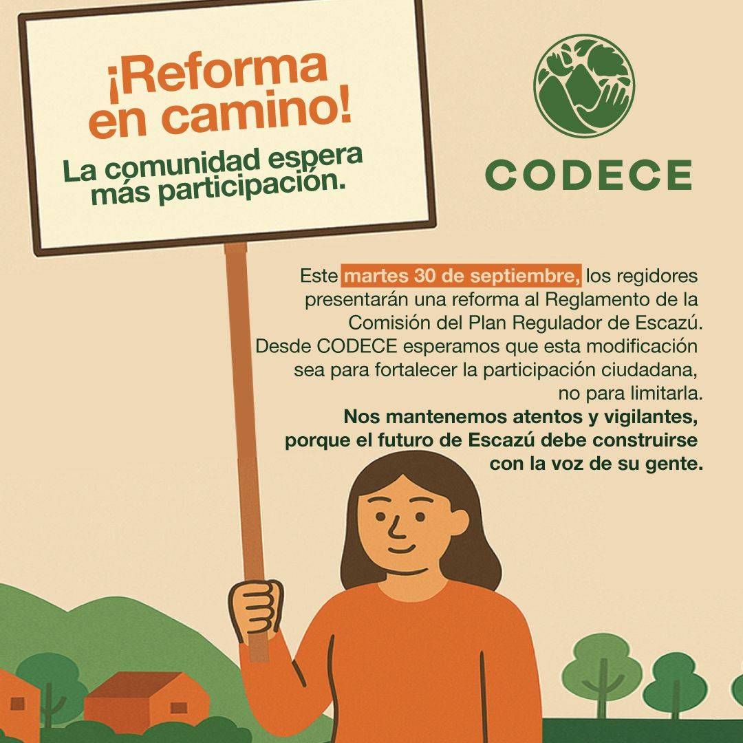 La organización CODECE informa a la comunidad de Escazú que este martes 30 de septiembre los regidores municipales presentarán una reforma al Reglamento de la Comisión del Plan Regulador de Escazú.