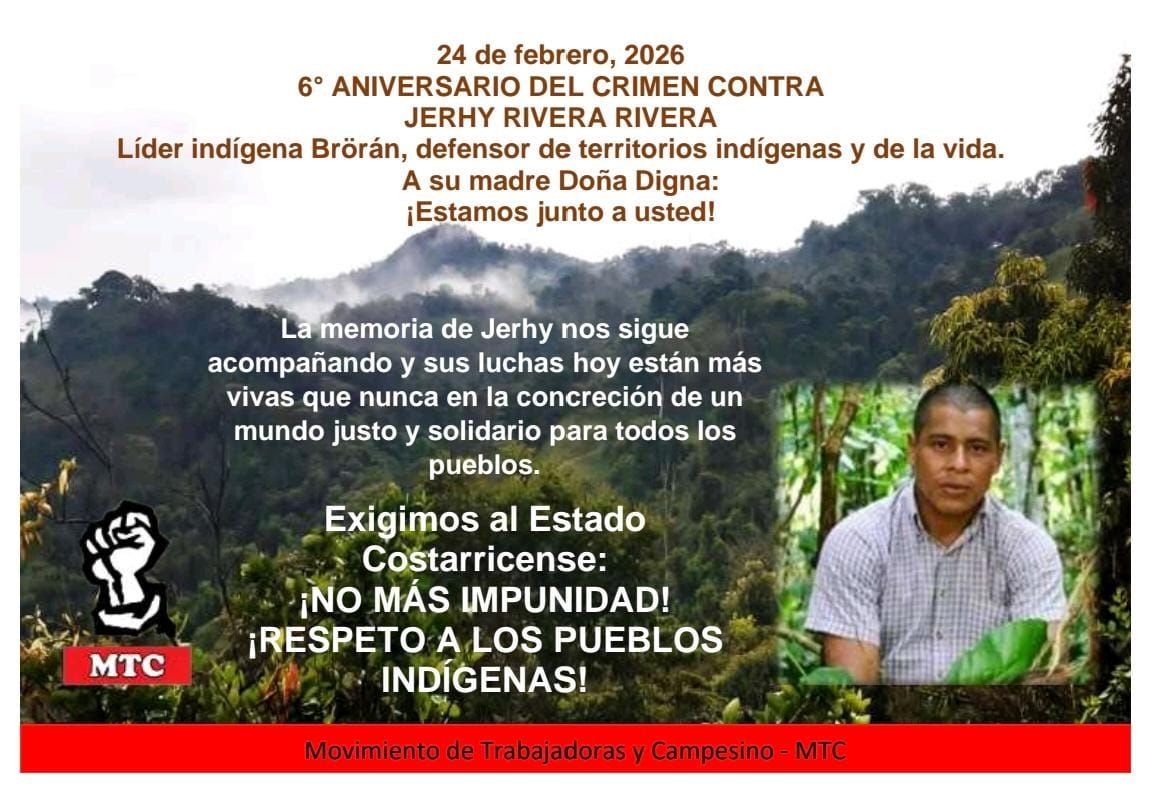 Sexto aniversario del crimen contra Jerhy Rivera Escrito en 25/02/2026. Publicado en Derechos. Compartir: Haz clic para compartir en Facebook (Se abre en una ventana nueva) Facebook Haz clic para compartir en WhatsApp (Se abre en una ventana nueva) WhatsApp Haz clic para compartir en X (Se abre en una ventana nueva) X Haz clic para compartir en Telegram (Se abre en una ventana nueva) Telegram Haz clic para enviar un enlace por correo electrónico a un amigo (Se abre en una ventana nueva) Correo electrónico Haz clic para compartir en Threads (Se abre en una ventana nueva) Threads Haz clic para compartir en LinkedIn (Se abre en una ventana nueva) LinkedIn impunidad, Jerhy Rivera, pueblos indígenas, Térraba, territorios indígenas Anterior Siguiente