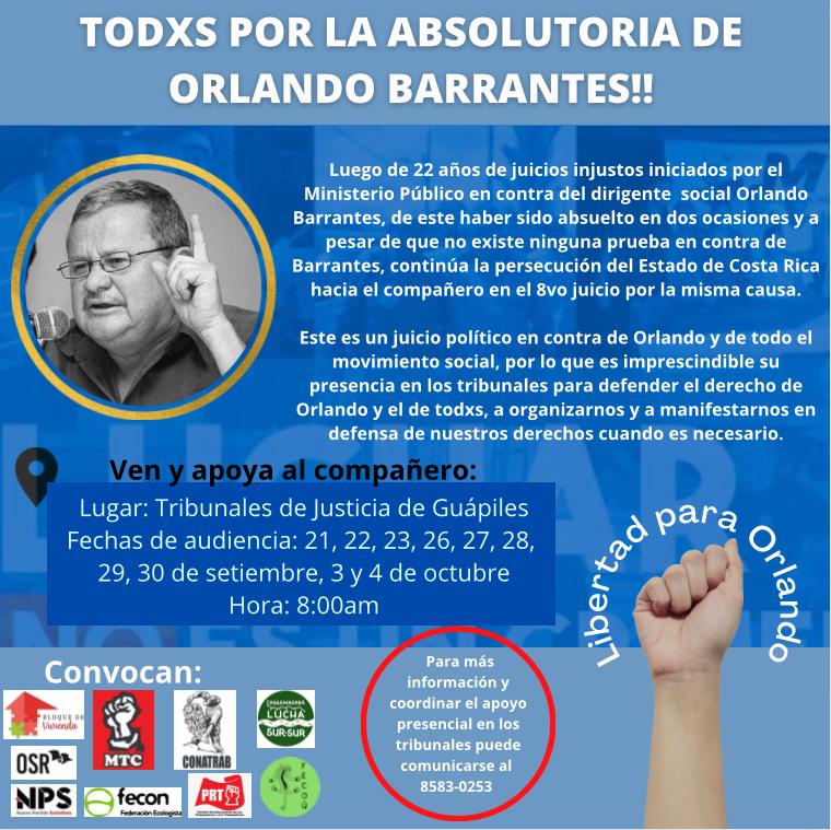 Luego de 22 años de juicios injustos iniciados por el Ministerio Público en contra del dirigente social Orlando Barrantes, de este haber sido absuelto en dos ocasiones y a pesar de que no existe ninguna prueba en contra de Barrantes se continúa la persecución del Estado costarricense en contra del compañero.