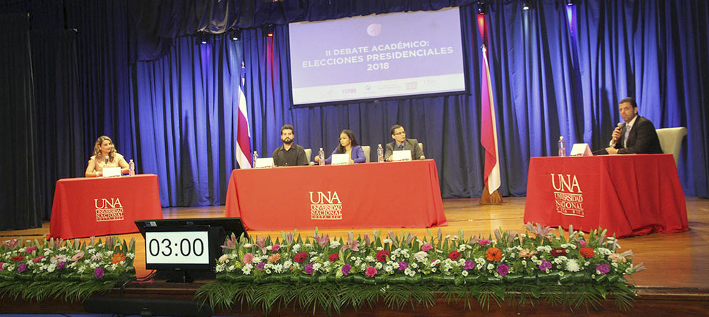 El pasado martes 31 de octubre de 2017, se llevó a cabo el segundo debate académico “UNA: Elecciones 2018”, con los candidatos Stephanie Campos Arrieta, Partido Renovación Costarricense (PRC); Rodolfo Hernández Gómez, Partido Republicano Social Cristiano (PRSC); Sergio Mena Díaz, Partido Nueva Generación (PNG); Mario Redondo Poveda Partido Alianza Demócrata Cristiana (ADC) y John Vega Masís Partido de los Trabajadores (PT). Este debate tuvo lugar en el Auditorio Clodomiro Picado de la Universidad Nacional-Campus Omar Dengo.
