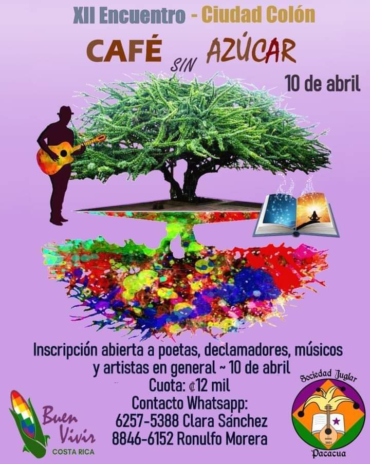 El próximo domingo 10 de abril del 2022 en Ciudad Colón, se llevará a cabo el XII “Café sin azúcar”; la inscripción es abierta a poetas, declamadores, músicos/as y artistas en general, el costo de la cuota de inscripción es de 12 mil colones.