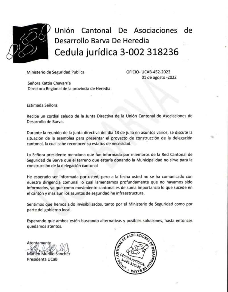 Mediante una carta hacia la directora regional de la provincia de Heredia Kattia Chavarría, la Unión Cantonal de Asociaciones de Desarrollo de Barva de Heredia expone su frustración a que no han sido informados sobre el proyecto de construcción de la delegación cantonal —con carácter de necesidad—.