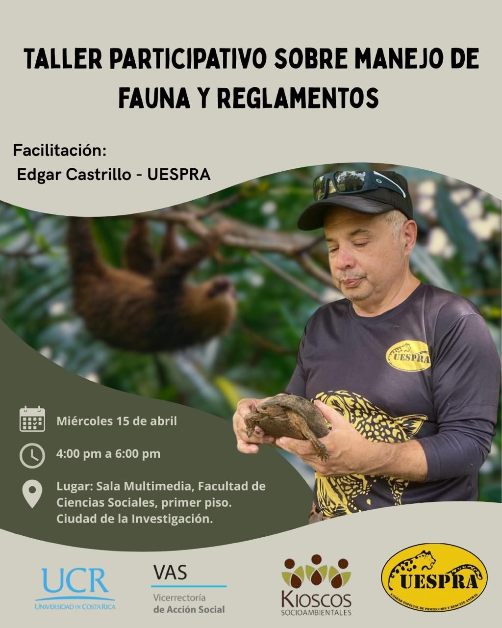 La Universidad de Costa Rica (UCR, a través de la Vicerrectoría de Acción Social y el programa Kioscos Socioambientales, invita al Taller participativo sobre manejo de fauna y reglamentos, un espacio orientado a promover el conocimiento y la convivencia responsable con la fauna silvestre.