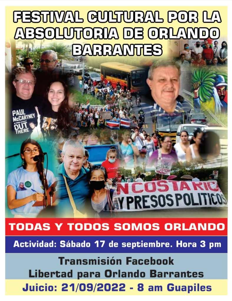 Este próximo sábado 17 de setiembre a las 3pm, estaremos realizando el Festival por la Absolutoria de Orlando Barrantes de forma virtual y transmitido por el Facebook «Libertad para Orlando Barrantes».