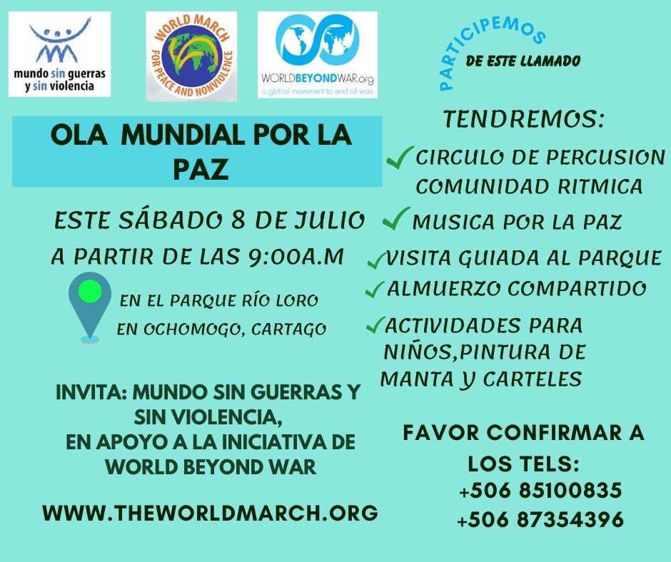 Mundo sin Guerras y sin Violencia Costa Rica, ha organizado esta actividad en el Parque Río Loro, a la que invitamos, para apoyar la Ola de Paz a su paso por Costa Rica.