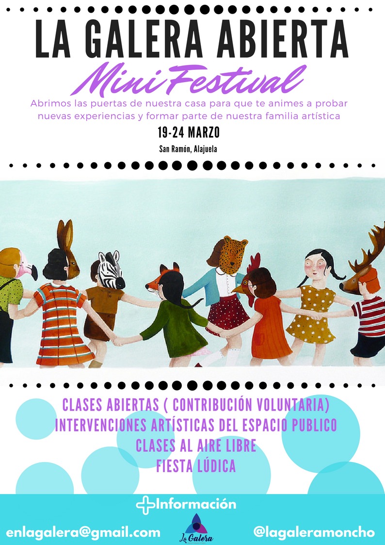 Del 19 al 24 de marzo en San Ramón de Alajuela, La Galera Abierta estará llevando a cabo el Mini festival el cual contará con actividades artísticas como clases abiertas al público de telas, lira, danza infantil, teatro; intervenciones artísticas en el espacio público entre otras.