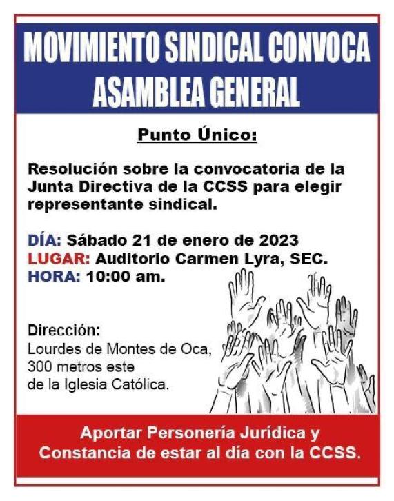 El movimiento sindical convoca a una Asamblea General este sábado 21 de enero de 2023 a las 10:00 a.m., en el Auditorio Carmen Lyra, SEC (Lourdes de Montes de Oca, 300 metros este de la Iglesia Católica). El tema a tratar es la resolución sobre la convocatoria de la Junta Directiva de la Caja Costarricense del Seguro Social (CCSS) para elegir un representante sindical.