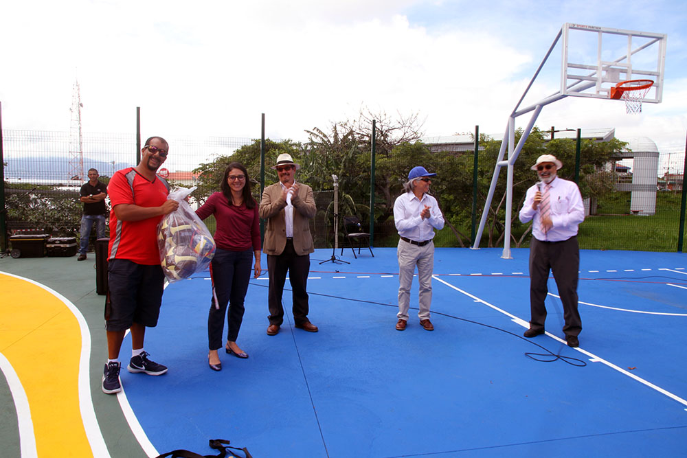 Posteriormente, mediante un juego de lanzamientos de tiros entre el Rector y el entrenador del equipo de basquetbol del Colegio Humanístico, el Dr, Salom sorprendió al colegio con un regalo, se trataba de bolas de futbol, basquetbol y voleibol.