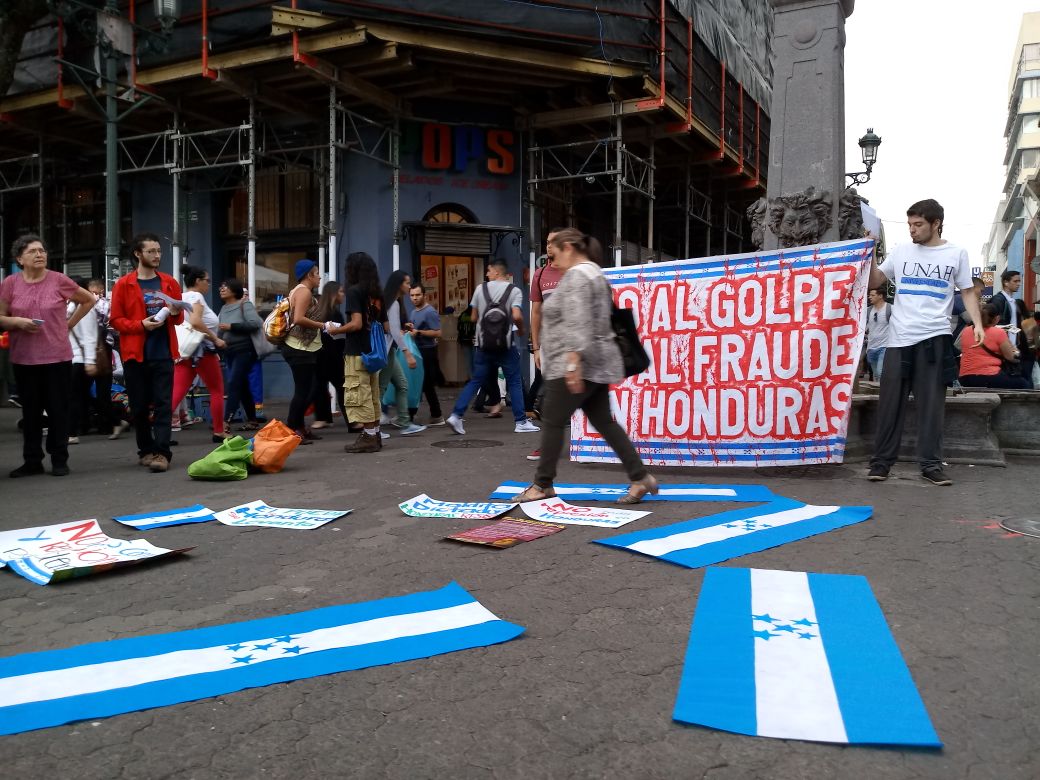 Este viernes 8 de diciembre se hicieron presentes en la Plaza de la Cultura para rechazar el posicionamiento del gobierno de Costa Rica, “pues defiende la institucionalidad corrupta de las estructuras políticas actuales del estado hondureño” según comunicado enviado a SURCOS (lea la nota completa del Mitin: