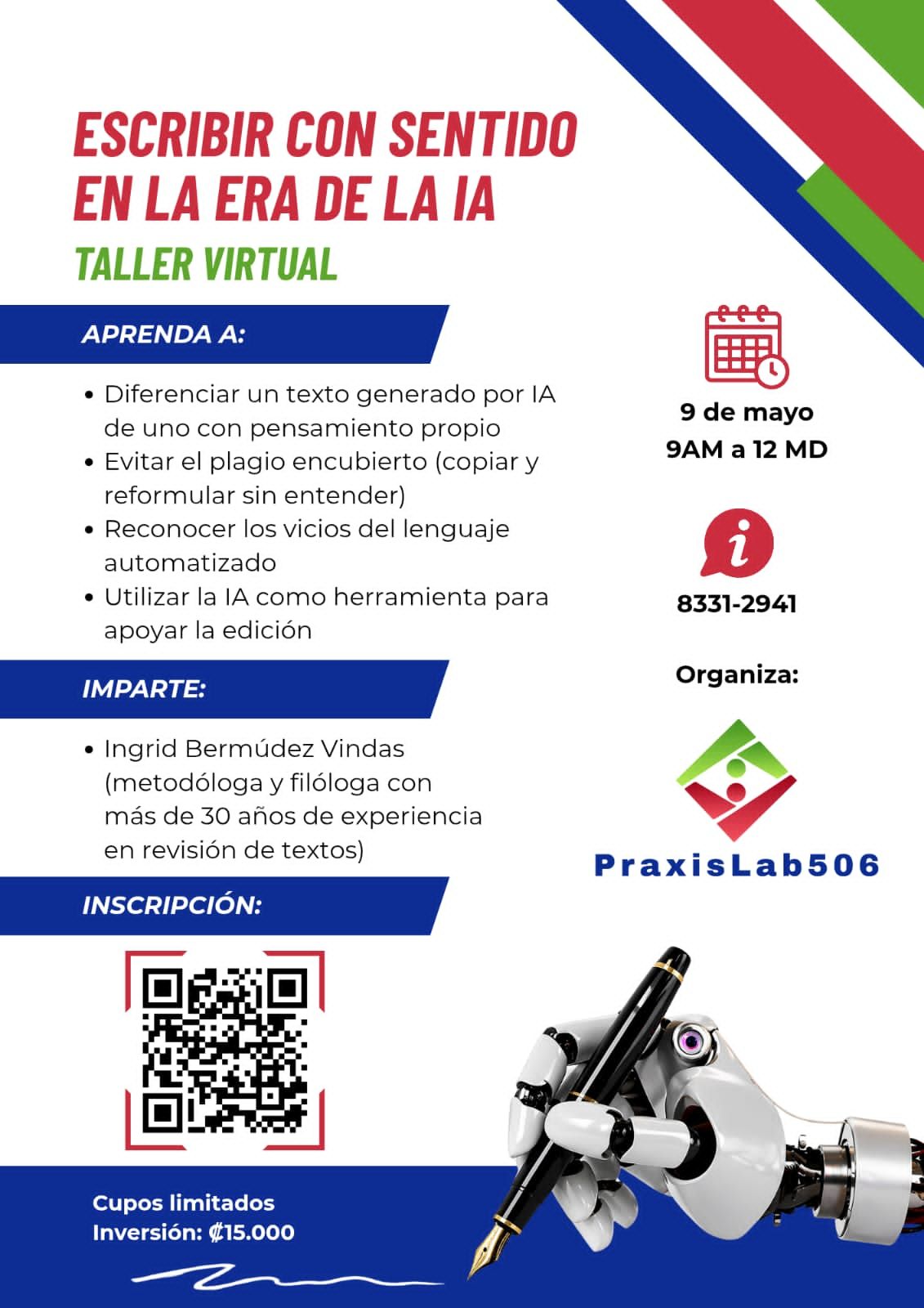 La actividad será impartida por Ingrid Bermúdez Vindas, metodóloga y filóloga con más de 30 años de experiencia en revisión de tesis, trabajos académicos, libros y textos profesionales, quien ha investigado de forma amplia los efectos del uso indiscriminado de la IA en la producción escrita.