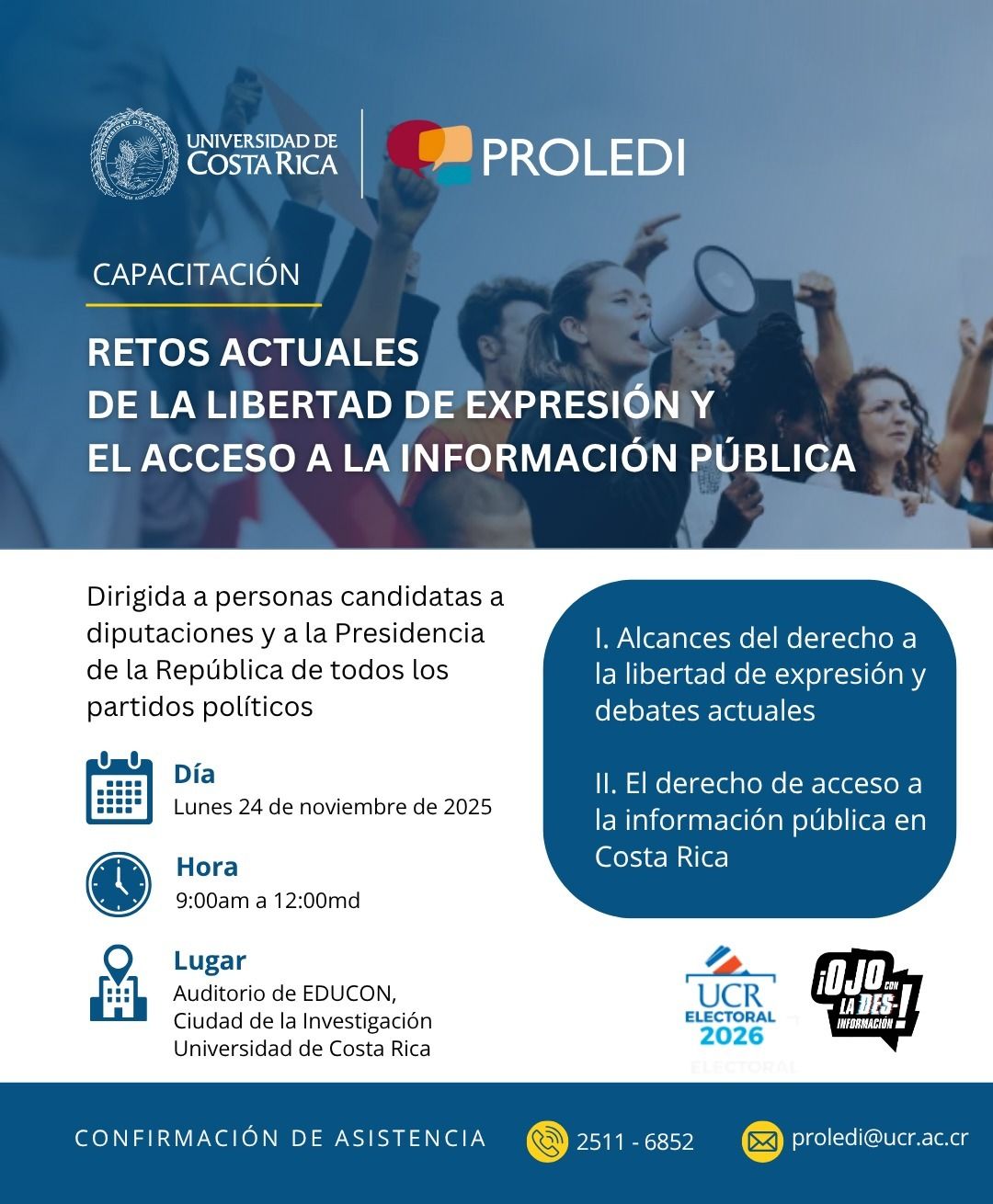 El Programa de Libertad de Expresión y Derecho a la Información (PROLEDI) de la Universidad de Costa Rica (UCR) convoca a una capacitación dirigida a personas candidatas a diputaciones y a la Presidencia de la República, como parte del proyecto UCR Electoral 2026 y la campaña #OjoconlaDesinformación.